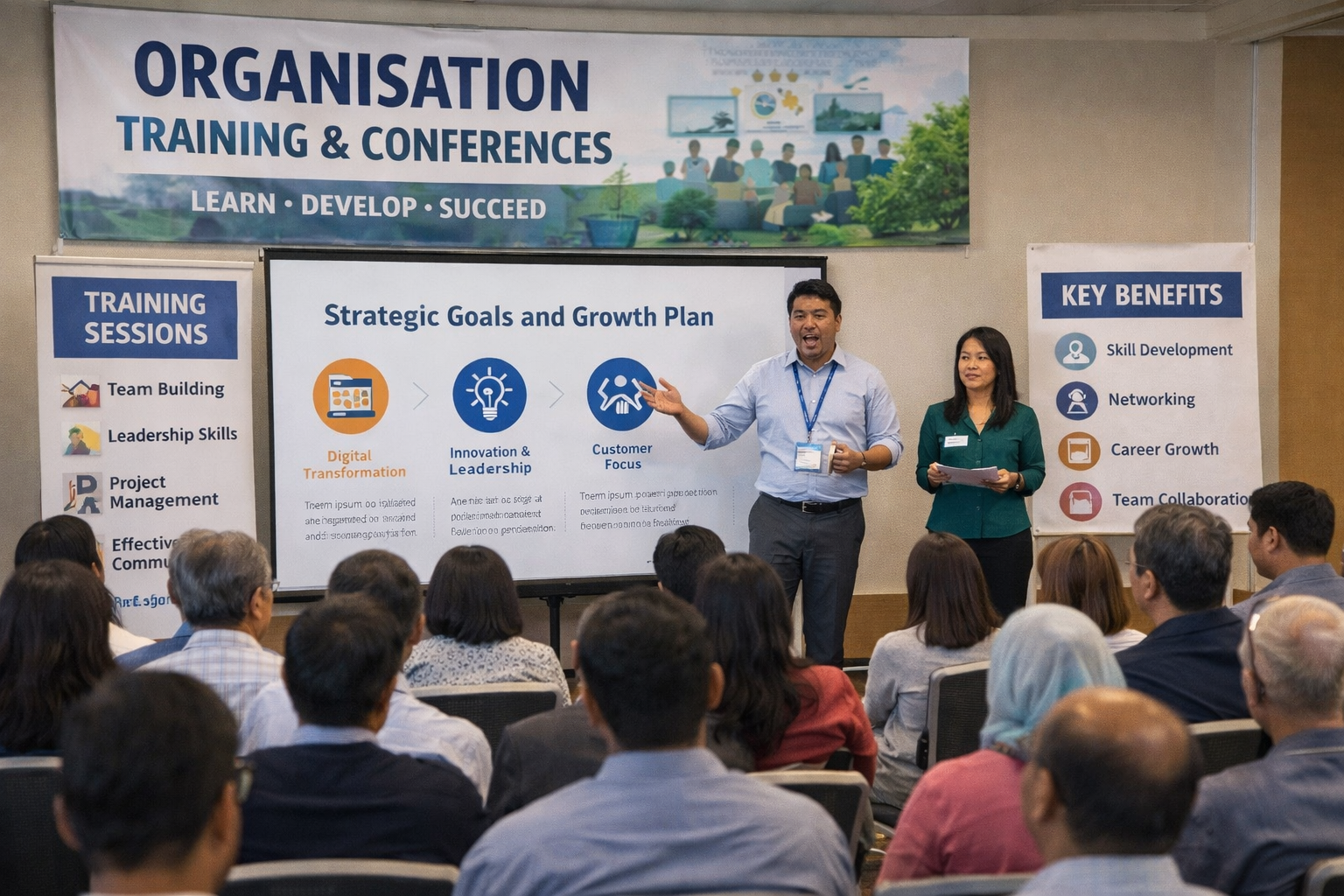 Organizing training and conferences involves setting clear objectives, forming committees, securing venues, and managing logistics to enhance employee skills, build communities, and achieve business goals. Effective events require strategic planning, such as developing themes, managing budgets, and fostering engagement, often beginning with small-scale events to ensure manageable growth